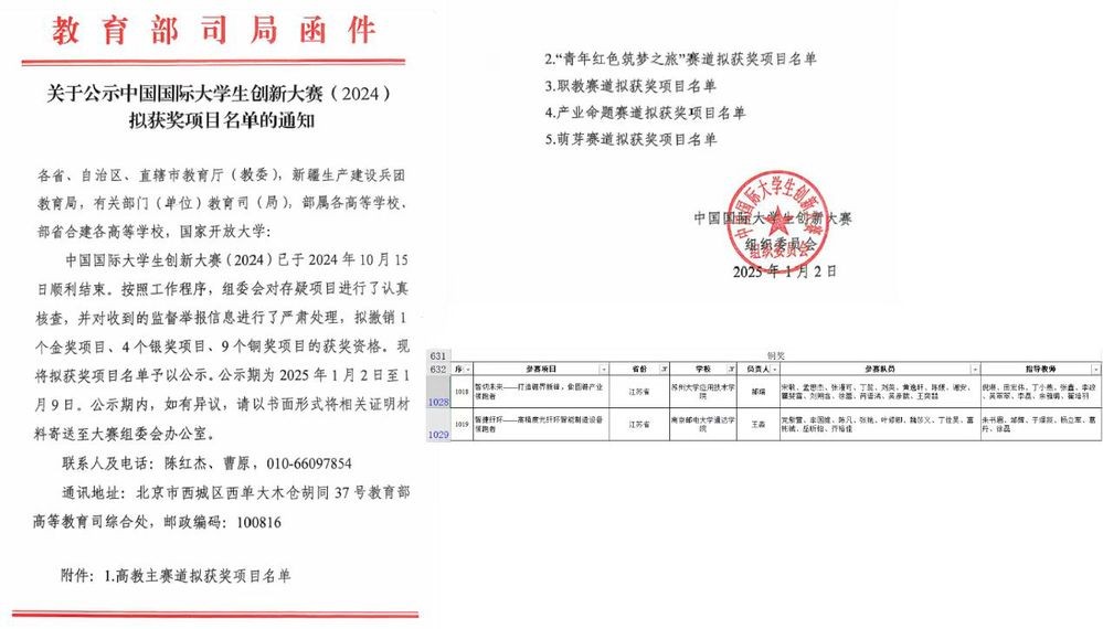 近日,教育部等12个中央部委单位和上海市人民政府联合主办的2024年中国国际大学生创新大赛成绩揭晓。我院学生获得了高教主赛道国赛铜奖的荣誉,本届大赛中全省仅有两所独立学院获国奖荣誉。