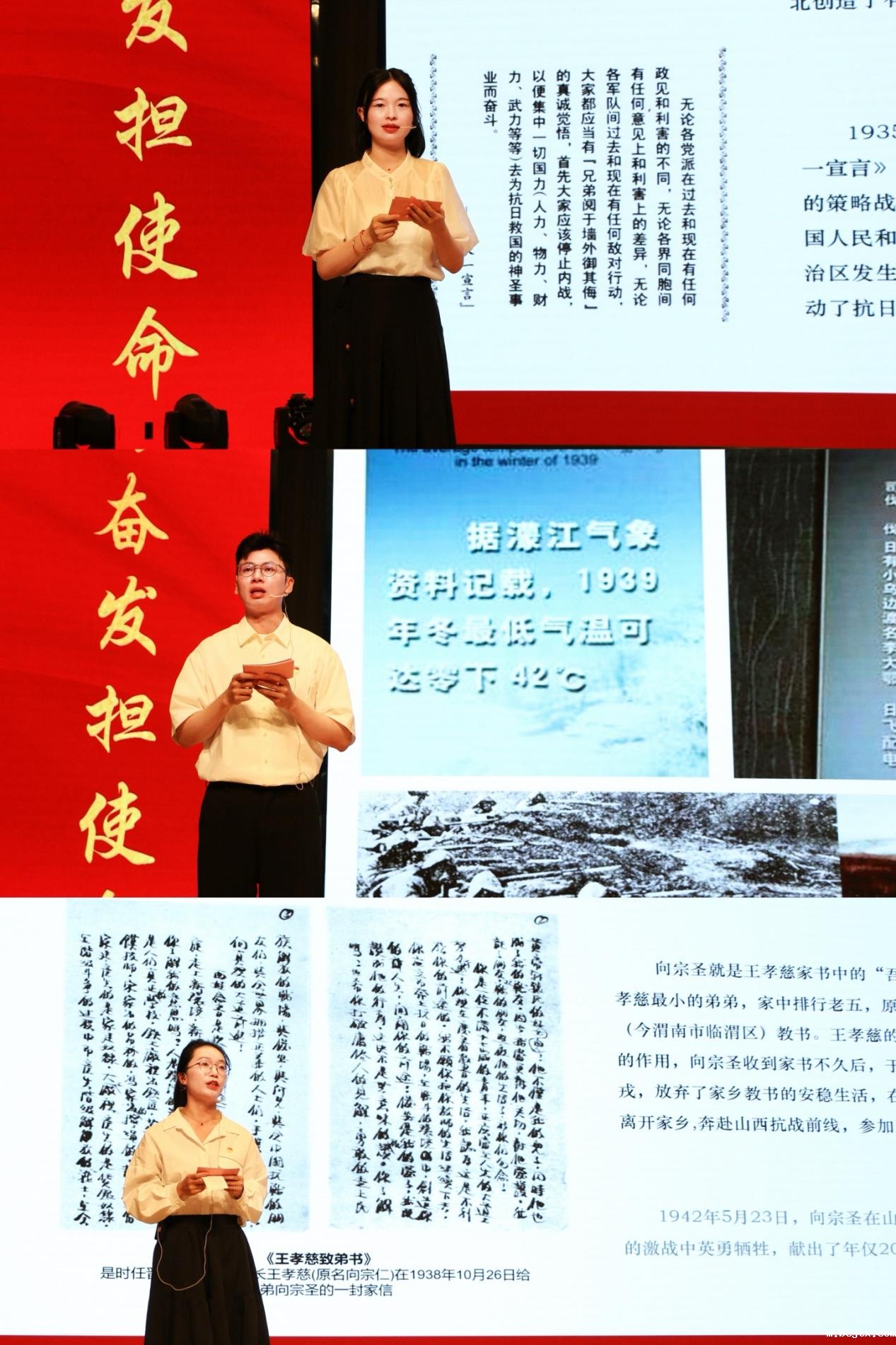 我院第四届辅导员宣讲团成员紧扣“中国人民抗日战争暨世界反法西斯战争胜利80周年”时间节点,围绕“浴血十四载,铸就民族魂”“热血护山河,丹心照汗青”“家书诉壮志,精神励后人”三个篇章,依托于珍贵历史影像与详实数据,全景式回顾了从1931年局部抗战到1945年全面胜利的壮阔历程,通过讲述震撼人心的抗战故事和演绎穿越烽烟的革命家书,生动勾勒出中华民族的精神群像,以沉浸式叙事与互动化表达形式,带领师生穿越历史烽烟,感悟伟大抗战精神的时代回响。