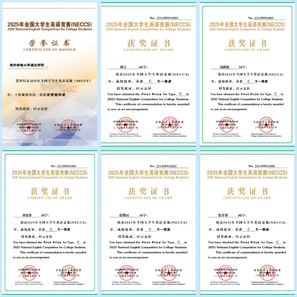 近日,2025年全国大学生英语竞赛(NECCS)圆满结束。我院参赛学生与来自全国1300余所高校的众多比赛选手同台竞技。其中,5人荣获C类(本科非英语专业)国家一等奖,22人荣获C类国家二等奖,37人荣获C类国家三等奖,充分展现了我院学子的英语综合素养和有效竞争力。同时,因竞赛组织工作突出,我院获得“优秀组织奖”荣誉称号。
